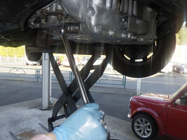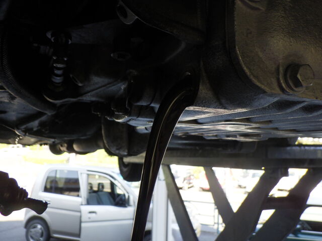 フロントサブフレームとミッション前面の隙間からオイルフィルタ―ケースをチェック。。