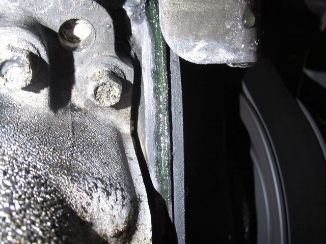 タイミングカバー辺りにはまだ乾かぬ緑染み・・・