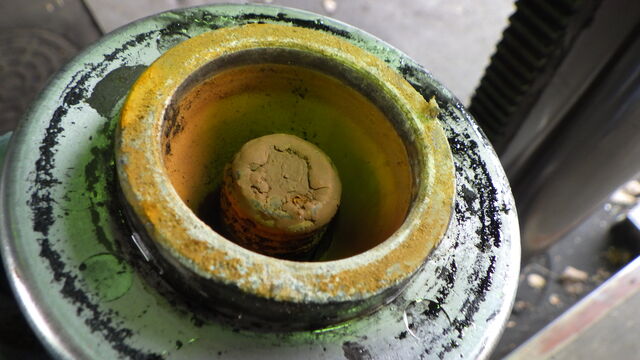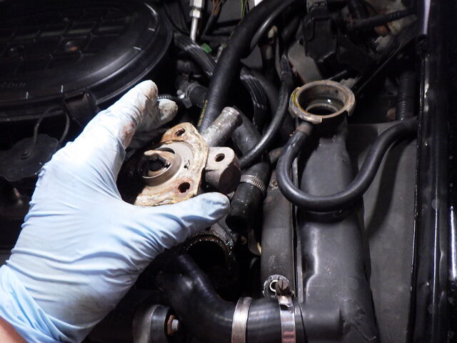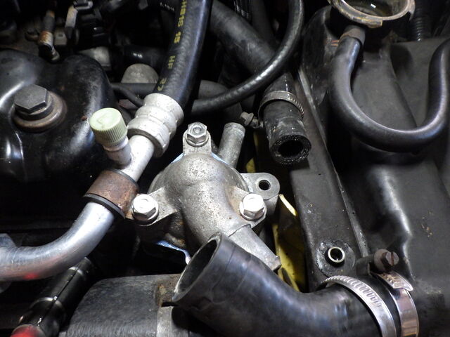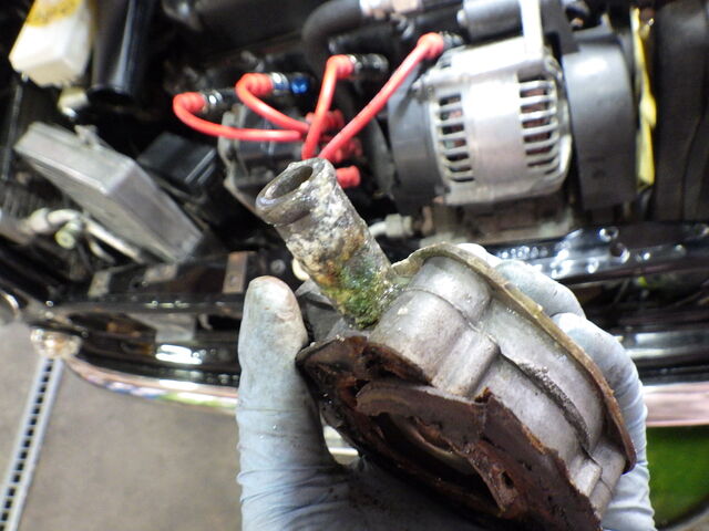 サーモハウジングの頭を外したところ、アッパーホースの接続部が緑色になっていました。
