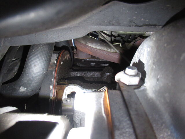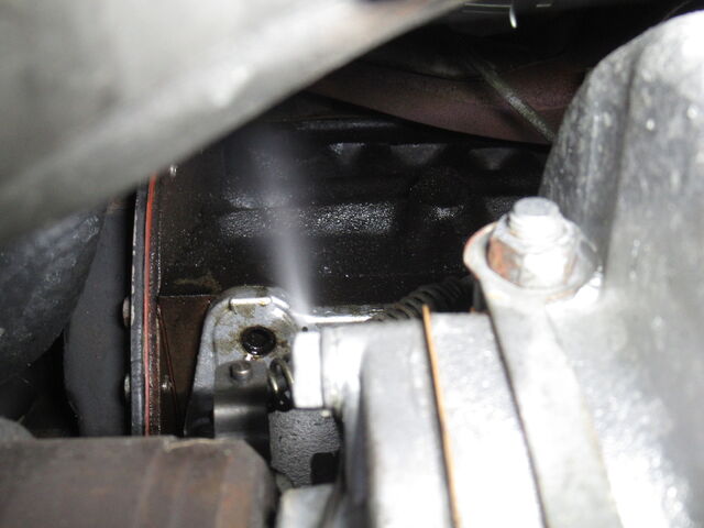 ふと見上げるとオイル漏れの上の方に見えるウォーターポンプ下にLLCぽい雫が見えます。