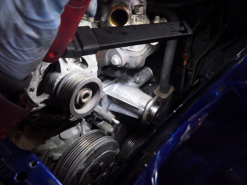 漏れの原因ウオーターポンプを取り外すため、クーラント抜いて水路の部品を外していきます、