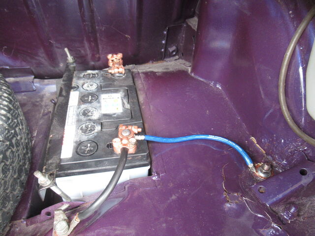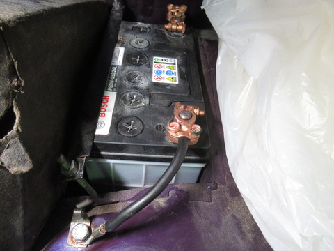 やはりそのままではかからず【バッテリー】⇔【エンジンブロック】をケーブルで繋ぐとブルン。