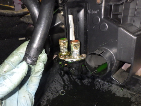 ヒーターバルブから漏れたLLCは乾かず下まで垂れています。