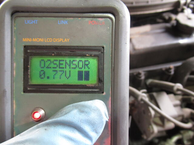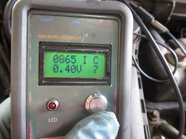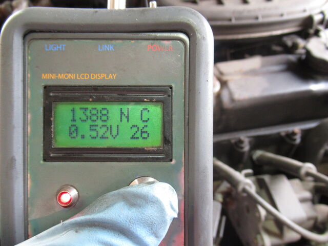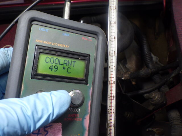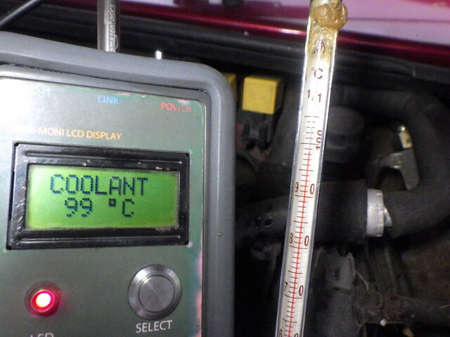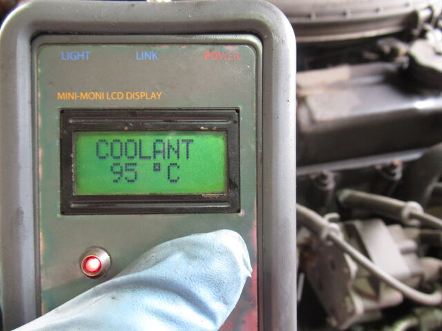 このくらいの温度の場合は通常、エンジン内の水温(ミニモニ)とラジエター(水温計)の温度に差が出るのですが同じ温度のまま水温が上がっていきます。
