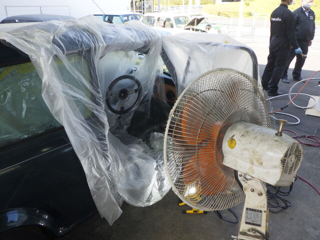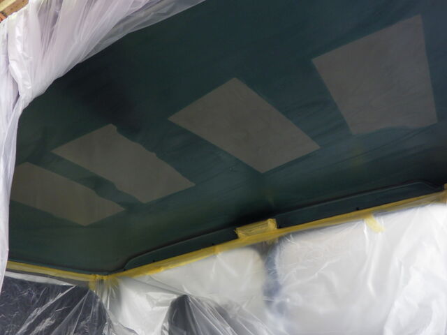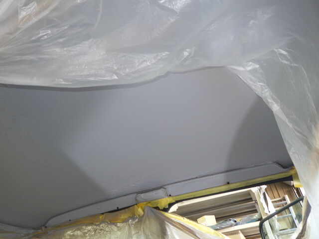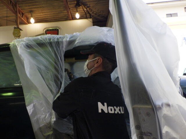 マスキング用のビニールが風で付いてしまったところがあるので完全に乾いてからもう一度上から吹いて修正します。