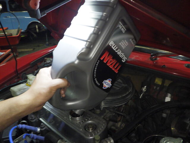オイルを入れていきます。今回入れたオイルはお持ちいただいたティターン15W50を入れました