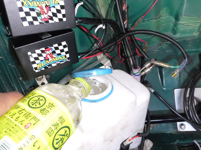 ベルト駆動のファンをなくしてフリクションロスを減らし電動ファンとウォータージェットで冷却する作戦なので、冷却用の水を補給してから決勝に臨みます。