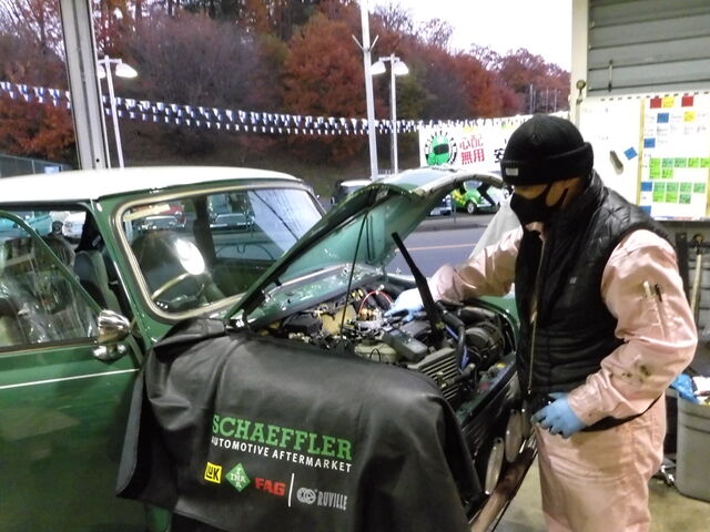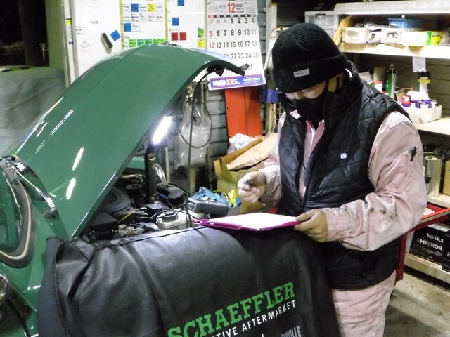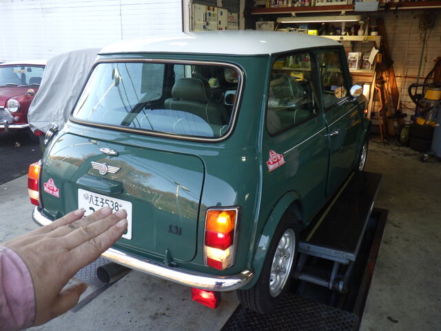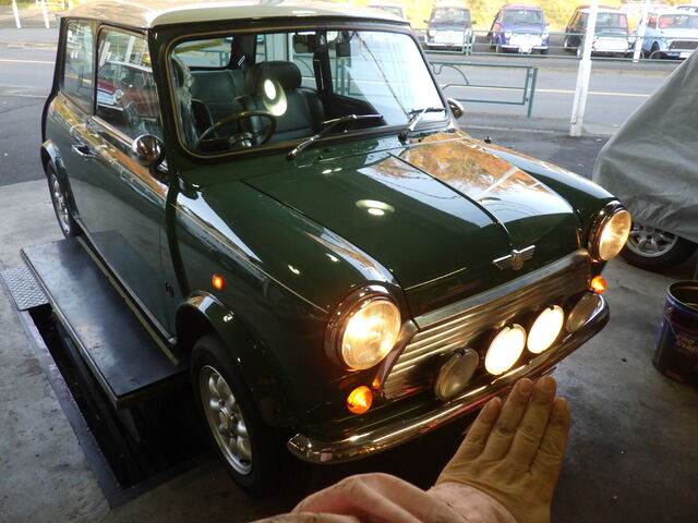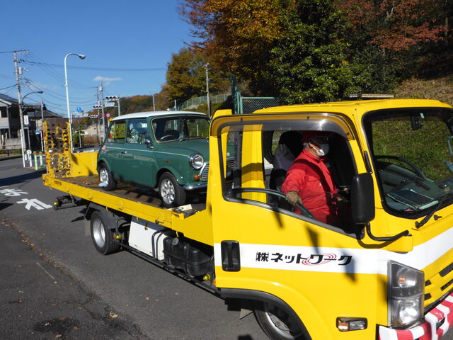 12/4(土)レッカーにて搬入されてきたアーモンドグリーンのミニ。