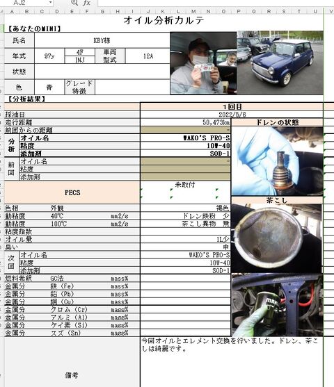 今回新しくオイルカルテを作成しました。オイル交換ごとにこちらのオイルカルテを更新していきます。