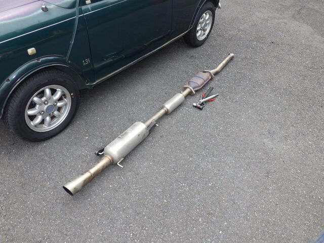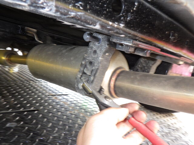 このまま移動するとエキゾーストが傷ついてしまうので一旦取り外します。