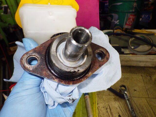 ブレーキオイルの漏れはブレーキマスターのピストンとシリンダーの間から発生していました。