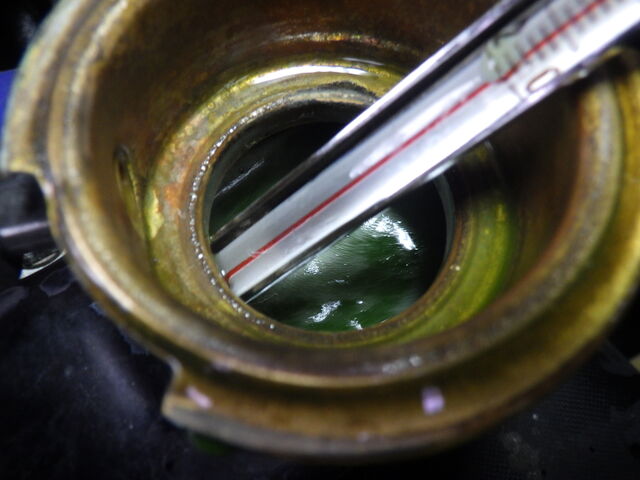 ラジエーターにクーラントが勢いよく流れ込んできました。このときの温度は84℃でした。サーモの開弁は良いようです。