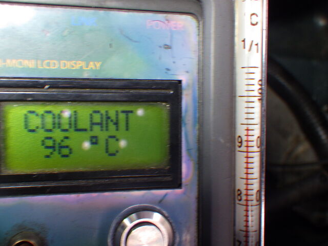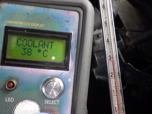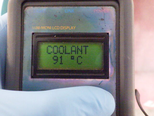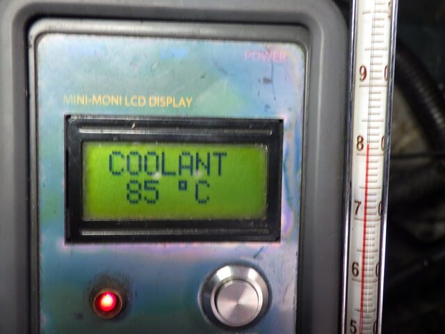 サーモスタッドの閉じチェック。ラジエーター側の水温計とエンジン側の水温センサーの温度が同じように上がっていきます。サーモスタッドの閉じが良くないようです。
