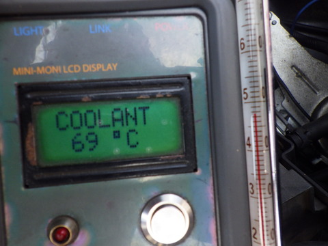 エンジン側のセンサーのミニモニと、ラジエーターの温度計にしっかりと差があります。サーモの閉じは良さそうです。