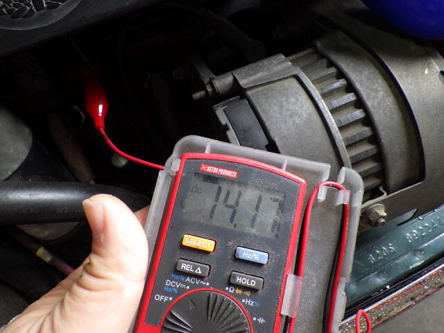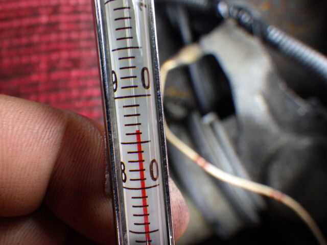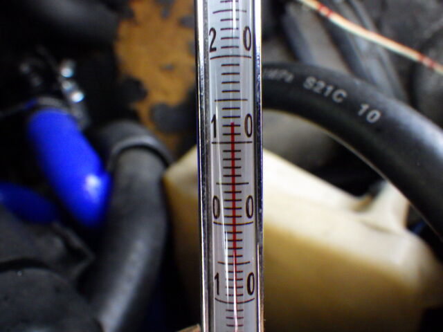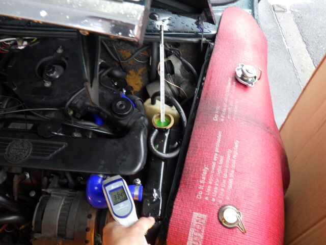 ラジエーターに水温計をいれてサーモスタッドの動作をチェック。