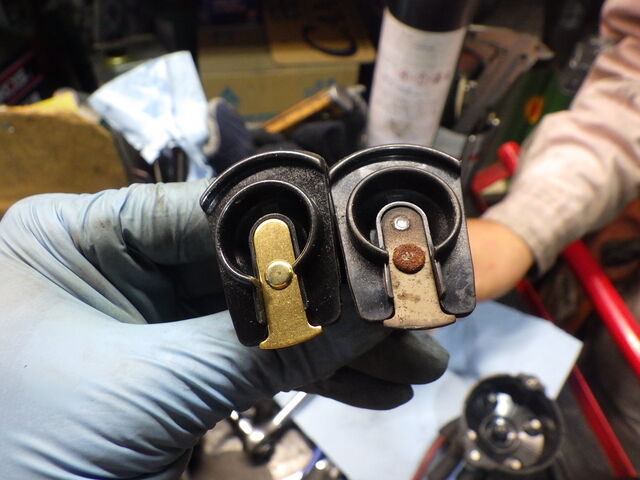 ライニングは、新品のものと比べると一目瞭然。フルードが染みてしまって色が濃くなっています。