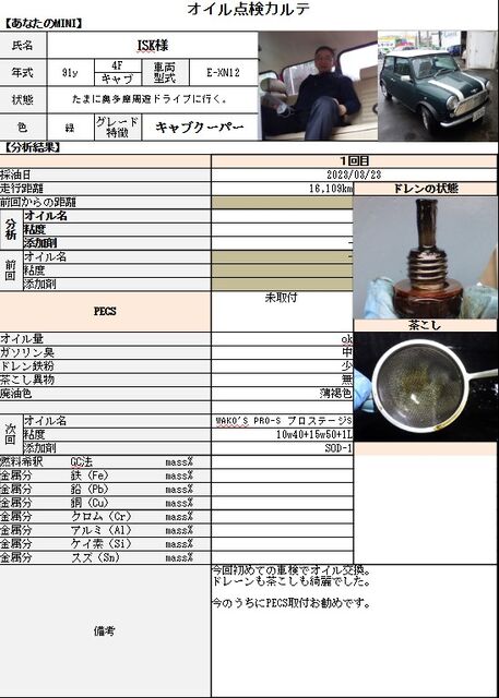 今回初めてのオイル交換でしたのでオイル点検カルテを作りました。