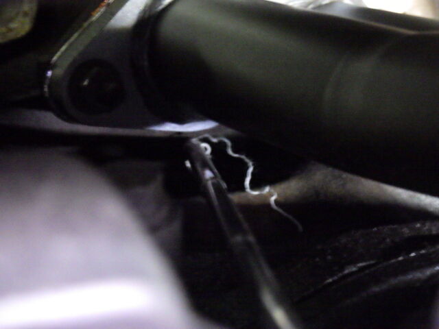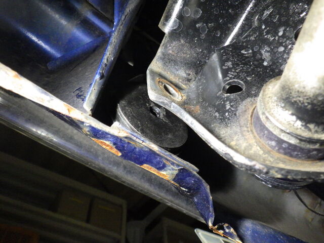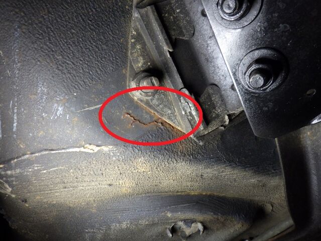 更に確認を続けると、左のサブフレーム角マウント付近のフロアにクラック、、、