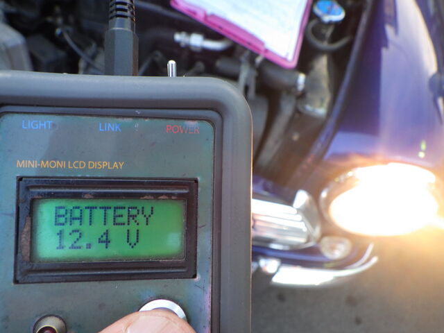 ヘッドライトとヒーターファンを回して12.4Vあります。。
