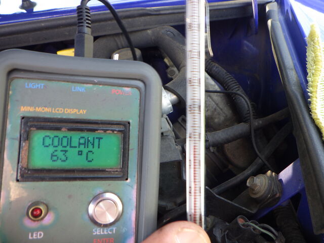 エンジン側の水温センサーは63℃まで上昇してますがラジエターに挿した温度計は38℃をキープ。