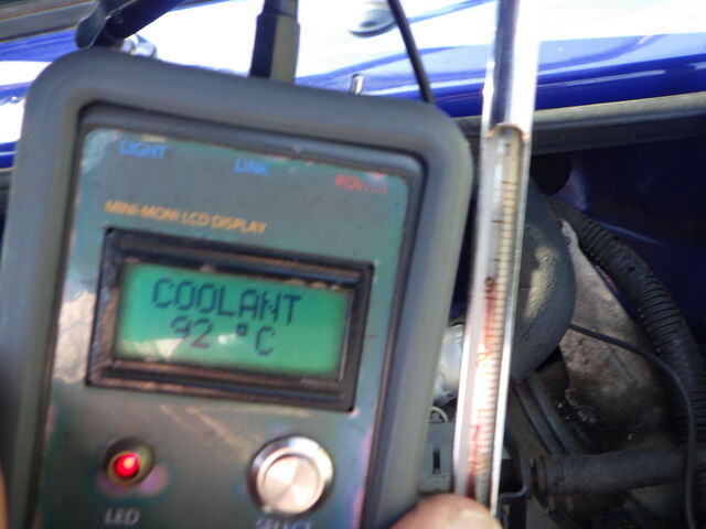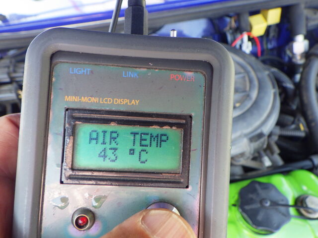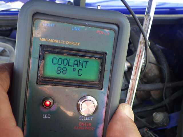 水温センサーの温度が87℃になったところでラジエターの温度計もぐんぐん上昇。。