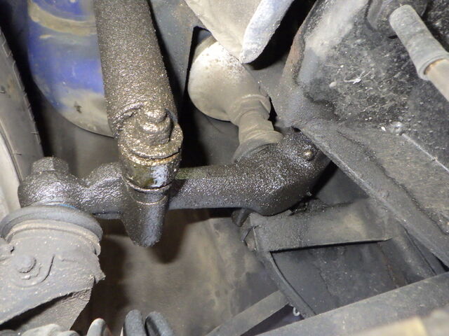 右足回りのショックとアッパーアーム周辺がご覧のとおり漏れたフルードでベットリ・・。