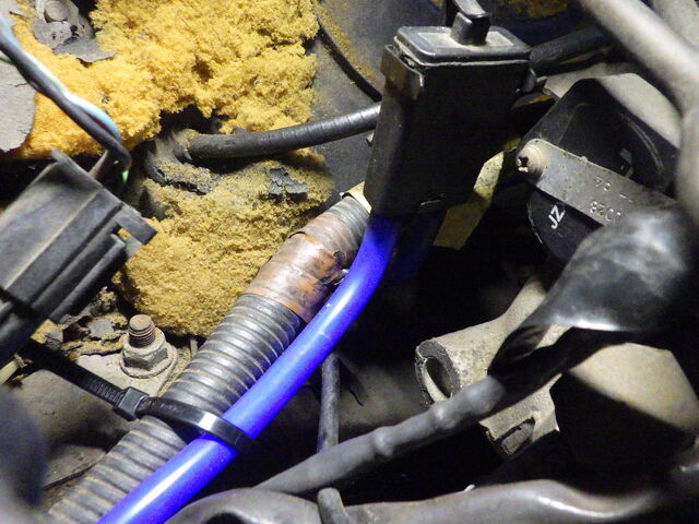 バイパスホースをクリップで止めてヒーターコアだけから逆流で吸い上げます。