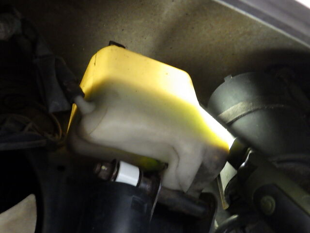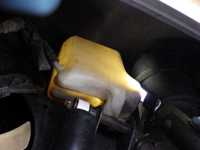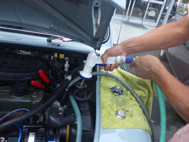バイパスホースをクリップで止めてヒーターコアから逆流で吸いだします