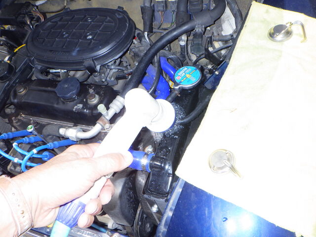 次はバイパスホースをクリップで止めてヒーターコアからだけ逆流で吸いだします。