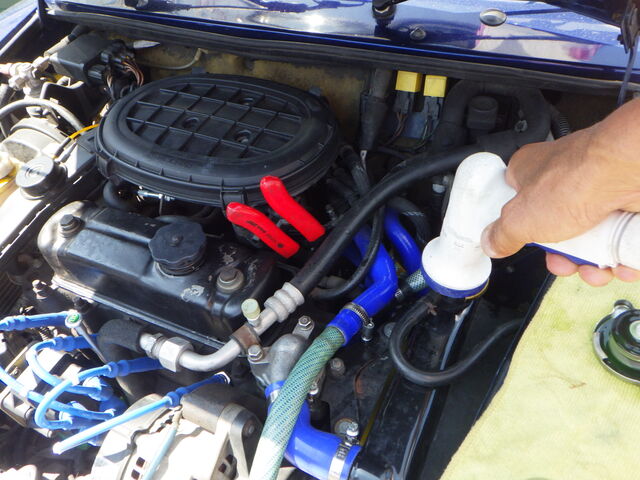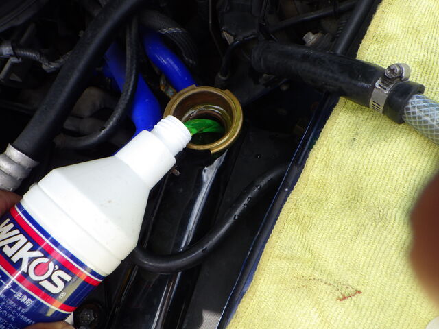ラジエターの水を少し入れ替えてから洗浄剤ラジエターフラッシュを入れてエンジン始動して洗浄開始