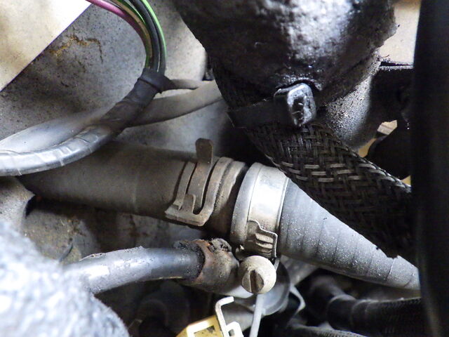 バイパスホースをクリップで止めてヒーターコアから逆流で吸いだします