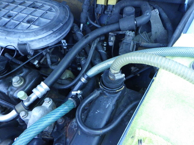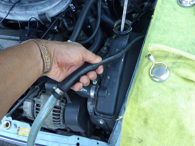 バイパスホースをクリップで止めてヒーターコアから逆流で吸いだします