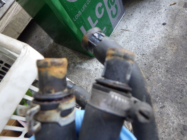 バイパスホースをクリップで止めてヒーターコアだけから逆流で吸い上げます。。