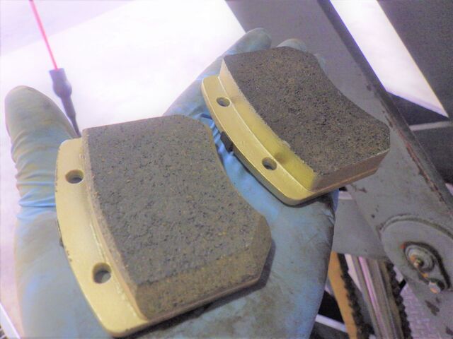 ブレーキパッドを取り外し。厚さの残量は残り3mmほど、ちょうど交換時期ですね。