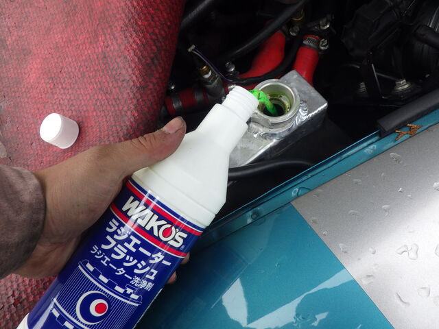 まずは、ラジエーター洗浄剤をいれて各種点検していきます。