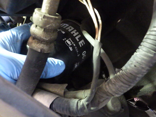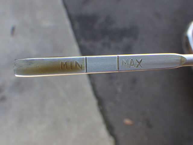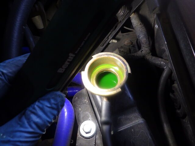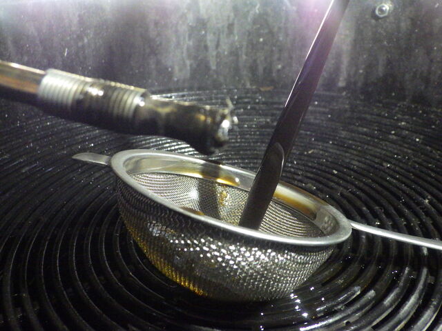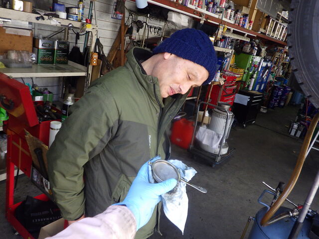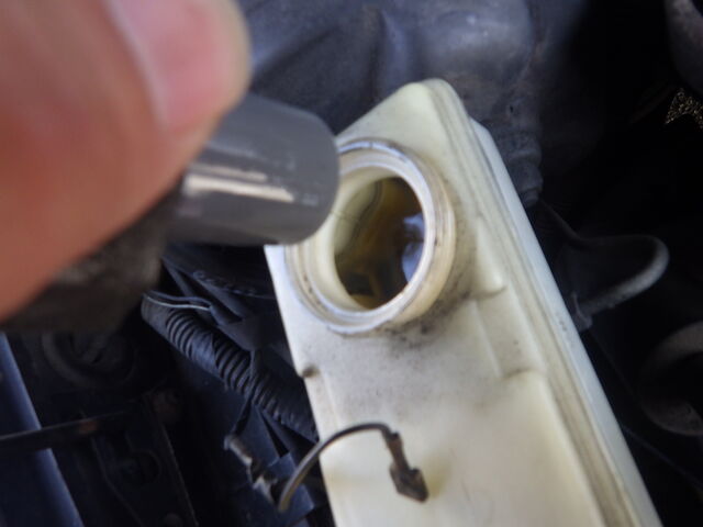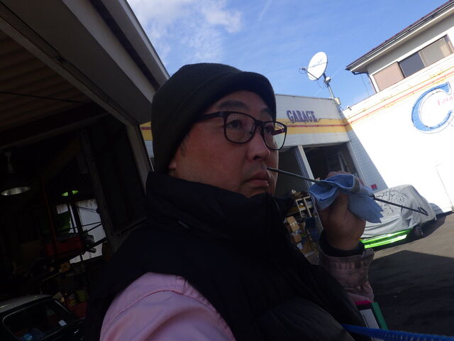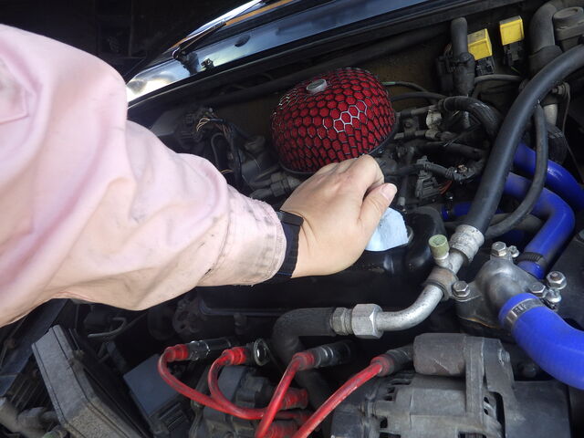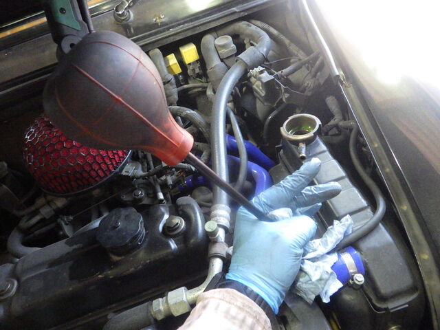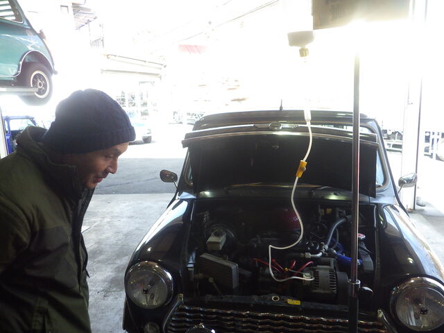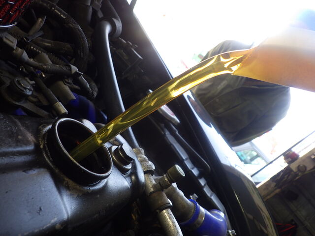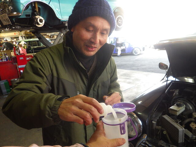 レベルゲージの穴から点滴ですこーしずつ時間をかけて入れていきます。