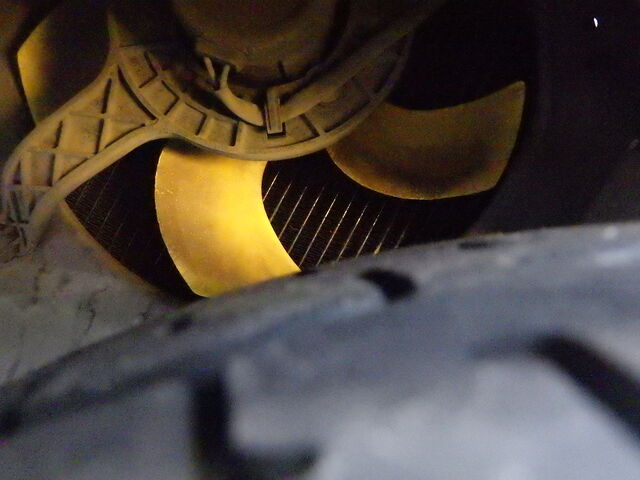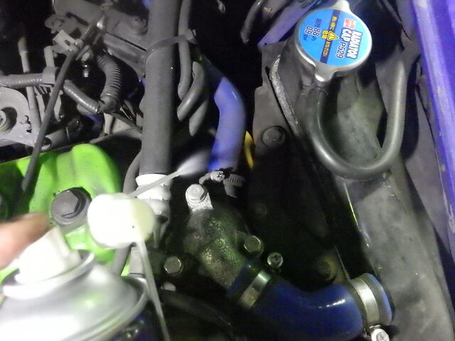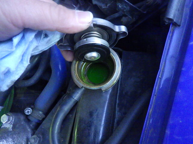 しかし、このあたりでラジエーターから少し吹いてきているのでキャップを締めて電動ファンの作動を待ちます。