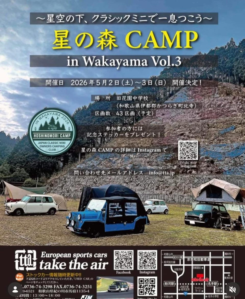 SHOP BLOG【イベント情報】 by streetmini2026年1月23日2026年1月23日 星の森CAMP Vol.3 まもなくエントリー募集致します。 参加して頂いてる皆様、今回も宜しくお願いします。 また初めて参加の方も宜しくお願いします。 インスタ #hoshinomoricamp 株式会社ジェイ・エム・エス・エー〒430-0807 静岡県浜松市中区佐藤二丁目25番25号《公式サイト》《Facebook》 ・お近くのミニスペシャルショップをお探しの方 SPECIAL SHOP ・厳選USEDミニはここにアクセス USED MINI