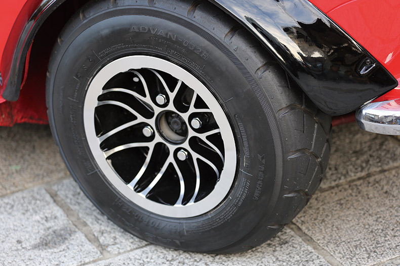 コスミックのホイールにSタイヤでほぼツライチ、程よいキャンバー角でカッコいい。マフラーはセンター出し。クラシックなガスキャップ。エンジンはウエーバーキャブでもちろんタコメーター装備。ステアリングは小径だ。
