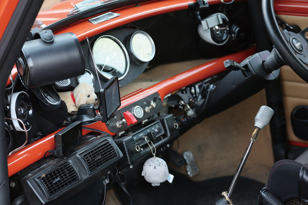 ピポットタイプのタコメーターは歴代のミニにも使用していたものを引き継いでモディファイしてあり歴史を感じる。