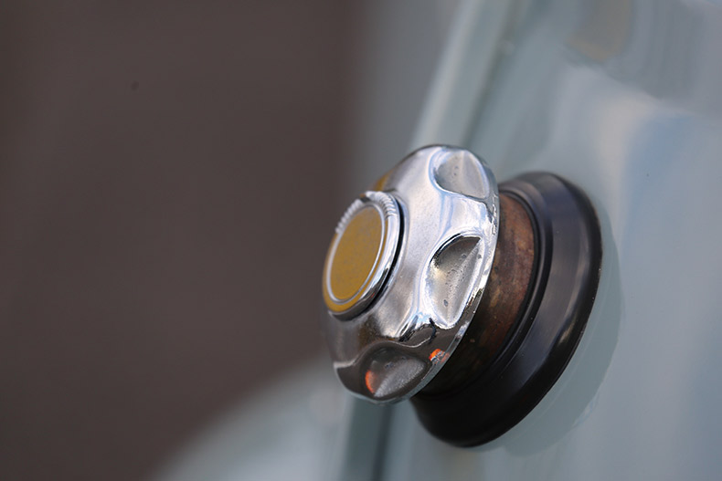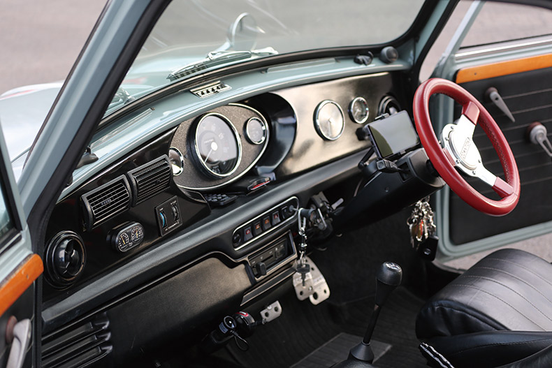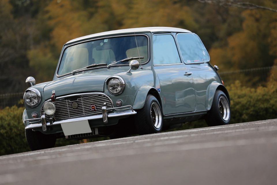 23年前に購入したお気に入りのメイフェアを2年前にモディファイしたというオーナーのUさん。グリーンだったボディを大胆にも現行のトヨタのラブフォーに採用されているグレイに変更。「私のイメージに一番近かったクラシックで中間色の絶妙なカラーリングは私にとってはもはや純正色です(笑)」と楽しそうに語る。グリルも換えたり、ボンネットストラップを付けたりしてカフェレーサー風に仕上げている。塗り替えるまではストラップも我慢していてようやく夢が叶ったそうだ。また10インチのタイヤはまだダンロップがつくっているので、こちらも助かっているらしい。現在ミニはプライベートで乗っているので大満足とのこと。