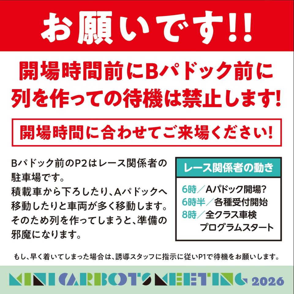 EVENT【ミニカーブーツミーティング】大切なお願い by streetmini2026年2月27日2026年2月27日 主催からの大切なお願いです。 Bパドック前での待機列は禁止します。 開場時間に合わせてご来場ください。 早朝はレース関係者の準備の時間になります。 レース関係者の邪魔になりますので P2周辺に列を作るのはおやめください。 共同開催ですが、 あくまでレースをしているサーキットの スペースをお借りしている立場です。 レース関係者ファーストでお願いします。 MINI Carboots Meeting 公式ページ https://www.facebook.com/minicarbootsmeeting/?locale=ja_JP ・お近くのミニスペシャルショップをお探しの方 SPECIAL SHOP ・厳選USEDミニはここにアクセス USED MINI 共有:FacebookX