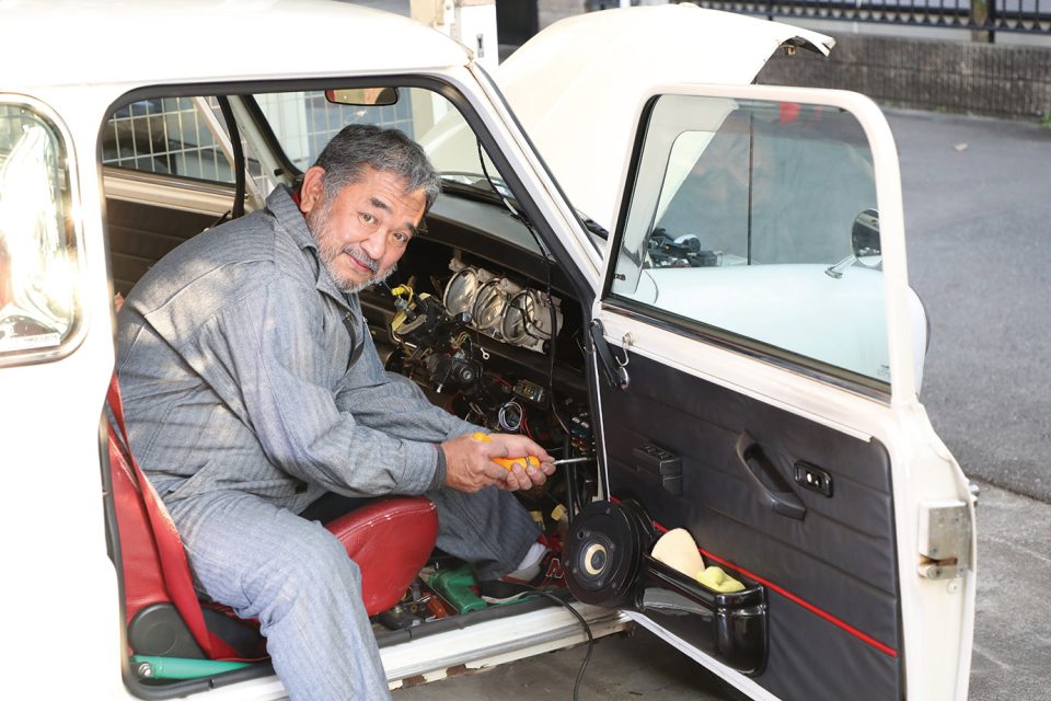 ミニの専門誌制作に携わって早32年というゴーリーたしろ。よって普段の愛車もクラシックミニを貫いているのだが、実は超が付くほどの新しモノ好き。それもあって、ゴールーの愛車は常に実験車としての役割を担っており、その結果、電装アイテムと配線が満載!