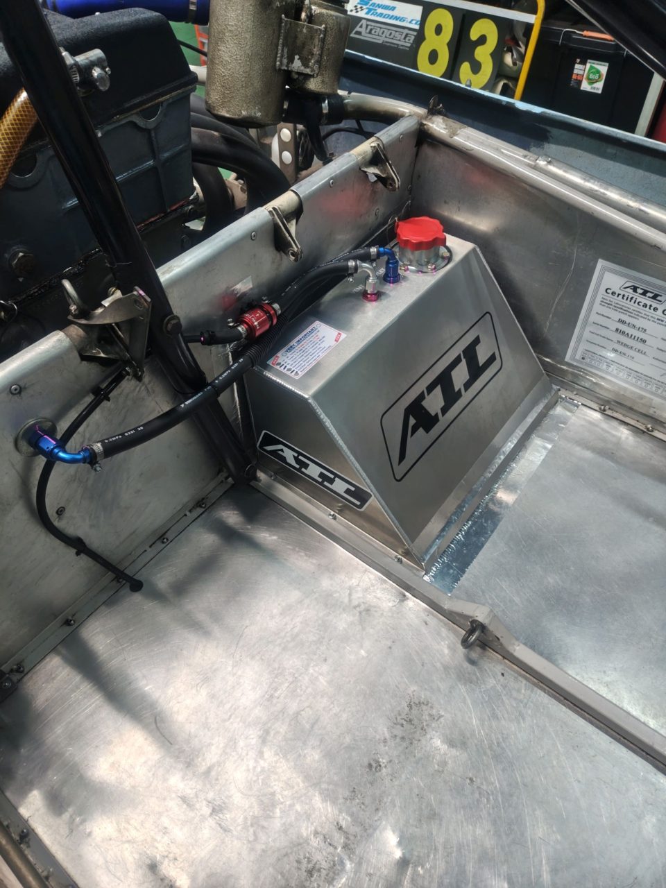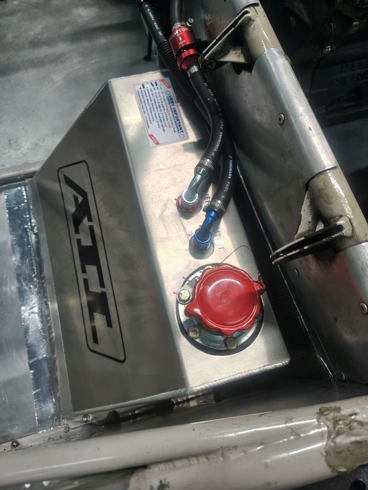 LOTUS 23B に、ATLフュエルタンクが設置されました。入庫した時には左サイドポンツーンに長いタンクが設置されていましたが、安全性を考慮し、ATLをフレーム内に収めました。1960年代のレーシングマシンは、設計も、ドライビングも、まさに勇気が試される作りですね。近代のレギュレーションに少しでも近づけるよう、工夫を凝らして仕様変更していきます。タンク容量は、SUPER BATTLE of MINIでお馴染み、超スプリント仕様を選びました。タンクの後ろがエキゾーストがレイアウトされるので、COOL ITをタンクの周囲に取り付け、少しでも熱を遮断します。シェイクダウンが楽しみです!
